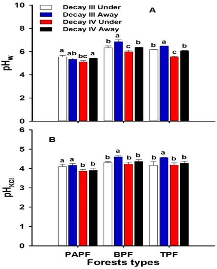 (A) pH in water (pHw) and (B) pH in KCl (pHKCl) values of the same dominant tree species PK with different decay classes at different distances in contrasting forest types of PAPF, BPF and TPF forest types in northeastern China. Significant changes between treatments within the same forest type are denoted by various lowercase letters. Tukey’s honest significant difference (HSD) post hoc; p < 0.05, mean ± SE = 3; the bars show standard errors.