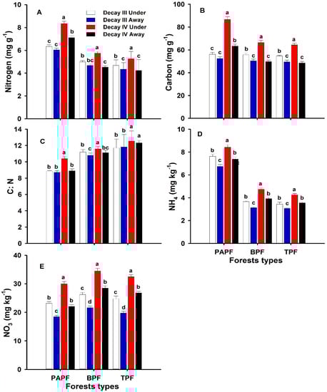 N (mg g−1) (A), SOC (mg g−1) (B), C:N (C), NH4-N (mg kg−1) (D) and NO3-N (mg kg−1) (E) concentrations of the same dominant tree species PK with different decay classes at different distances in contrasting forest types of PAPF, BPF and TPF in northeastern China. Significant changes between treatments within the same forest type are denoted by various lowercase letters. Tukey’s honest significant difference (HSD) post hoc; p < 0.05, mean ± SE = 3; the bars show standard errors.