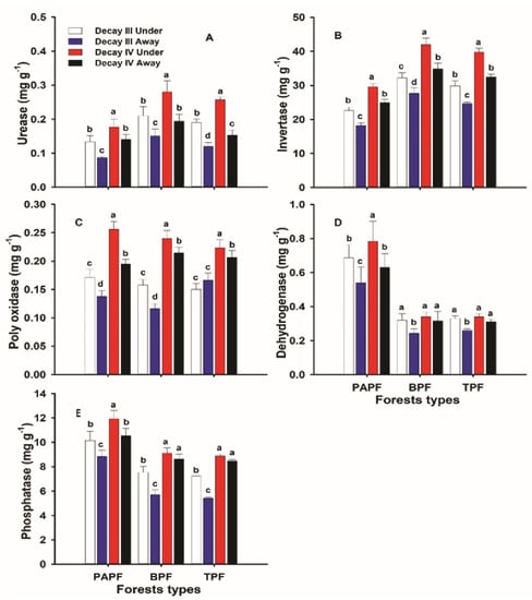 Urease (mg g−1) (A), invertase (mg g−1) (B), poly oxidase (mg g−1) (C), dehydrogenase (mg kg−1) (D) and phosphatase (mg kg−1) (E) concentrations of the same dominant tree species PK with different decay classes at different distances in contrasting forest types of PAPF, BPF and TPF in northeastern China. Significant changes between treatments within the same forest type are denoted by various lowercase letters. Tukey’s honest significant difference (HSD) post hoc; p < 0.05, mean ± SE = 3; the bars show standard errors.