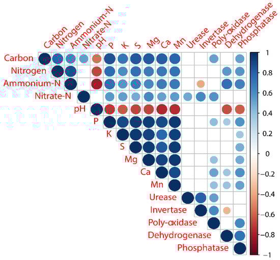 Looking at the trait interactions, C, N, ammonium and nitrate were positively related significantly to P, K, S, Mg, Ca, Mn and phosphatase (Figure 6). The pH was negatively related significantly to C, N, P, K, S, Mg, Ca, Mn, dehydrogenase and phosphatase. C and Mg were positively related significantly to poly oxidase and phosphatase. N and NH4 were positively related significantly to dehydrogenase and phosphatase. Nitrate was positively related significantly to urease, invertase and poly oxidase. P, Ca and Mn were significantly positively related to poly oxidase, dehydrogenase and phosphatase. K and S were positively related significantly to phosphatase. Urease and invertase were positively related significantly to poly oxidase, while invertase was considerably negatively correlated to dehydrogenase. Poly oxidase and dehydrogenase were found to be considerably positively correlated to phosphatase (Figure 6).