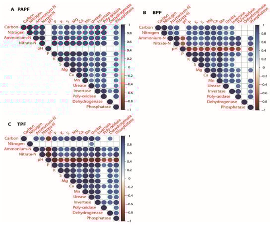 For the traits of the interaction across types, C was found to be significantly positively correlated to N in the PAPF and BPF, while considerably negatively correlated to the soil pH in the TPF (Figure 7A,B). N was found to be noticeably positively correlated to NH4, NO3, P, K, S, Mg, Ca, Mn and invertase in the PAPF and BPF. The soil pH was found to be noticeably negatively correlated to P, K, S, Mg, Ca, Mn, urease, invertase, poly oxidase and phosphatase in the BPF and TPF (Figure 7B,C). P was found to be considerably positively correlated to poly oxidase in the TPF. Dehydrogenase was found to be significantly positively correlated to P, K, S, Mg, Ca, Mn and urease in the TPF. Poly oxidase was found to be noticeably positively correlated to K and S in the PAPF (Figure 7A). Dehydrogenase was found to be considerably positively correlated to phosphatase in the TPF (Figure 7C).