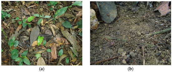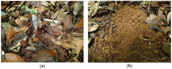 Leaf litter (a) and mountainous red-yellow humus–ferrallitic soil (b) sampled from Site 1 of the Kon Chu Rang Nature Reserve.