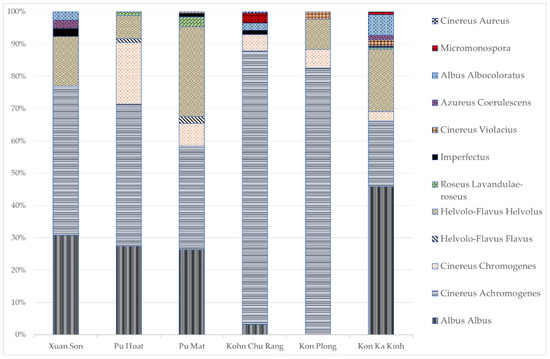 In the territory of the Xuan Son National Park, two types of soils were analyzed: dark brown ferrallitic and mountainous dark brown ferrallitic. In the flatland soil and substrates associated with it, the abundance of actinomycetes was higher than in the mountainous soil, reaching the maximum value of 1.0 × 108 CFU/g in the litter; the greatest length of the actinomycete mycelium was noted there as well, 1000 m/g. In the mountainous soil, a high content of mycelium was also observed; however, unlike the flatland soil, its content in the litter was two times lower. The taxonomic structure of the actinomycete community was dominated by Albus albus and Cinereus achromogenes sections and series (Figure 3).