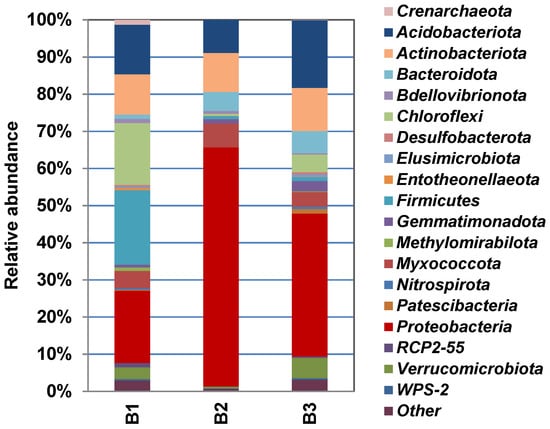 Taxonomic classification of prokaryotic communities (at the phylum level) in libraries of 16S rRNA gene fragments derived from samples of alluvial brown soil (B1), leaf litter (B2) and soil from epiphyte baskets (B3) collected in the territory of the Pu Hoat Nature Reserve.