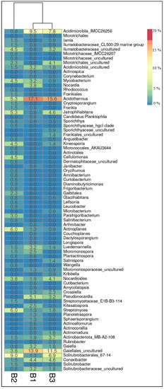 Taxonomic classification of genera within the Actinobacteriota phylum in libraries of 16S rRNA gene fragments (according to SILVA) derived from samples of alluvial brown soil (B1), leaf litter (B2) and soil from epiphyte baskets (B3) collected from the territory of the Pu Hoat Nature Reserve. The numbers in the diagram indicate the percentage of the number of sequences in the library within the Actinobacteriota phylum in each sample examined.
