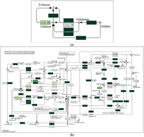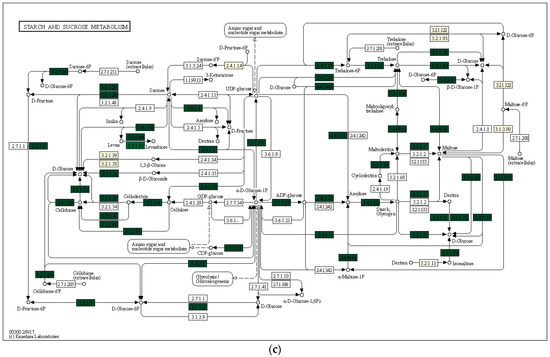 Using the Local Mapper module of the iVikodak program and the KEGG database, we conducted an analysis of the enzymes of the starch and sucrose metabolism pathway that are potentially produced by the studied communities (Figure 7).