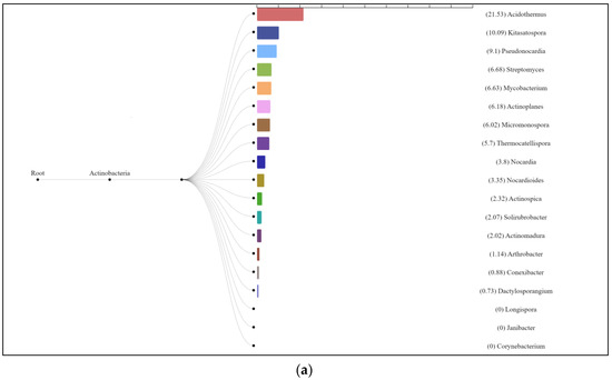 The enzyme cellulase [EC 3.2.1.4] which degrades cellulose to D-glucose was identified in all three analyzed natural substrates collected from the Pu Hoat Nature Reserve. The enzyme was most abundant in samples of alluvial brown soil and soil from epiphyte baskets and to a lesser extent in a sample of leaf litter (Figure 7). The contribution of individual taxa of the Actinobacteriota phylum to the cycle of starch and sucrose degradation is shown in Figure 8. Of note is the high activity in the biodegradation of cellulose shown by representatives of the genus Acidothermus (21.53% and 22.61% for alluvial brown soil and soil from epiphyte baskets, respectively). In leaf litter, predominant in the degradation of cellulose are representatives of the genera Actinoplanes (24.65%) and Streptomyces (19.98%).