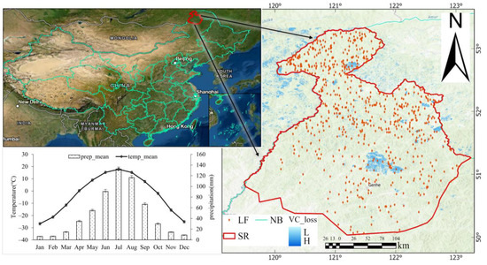 Study region maps: upper left is location of study region; lower left is historical monthly precipitation and temperature; right is lightning-induced fires and historical (2001–2021) vegetation loss (LF: lightning-caused fires, SR: study region, NB: national border, VC_loss: vegetation loss).