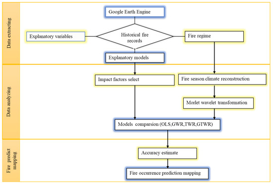 Our study is based on a combination of fire records and multi-sensor satellite observations, using a geographically and temporally weighted regression (GTWR) model. We aim to explore the spatiotemporal fire regimes in forest fires and its correlation with surface influence factors between 1986–2020 in the boreal forest of the Great Xing’an Range of Inner Mongolia. The purpose of this study is to: (1) Find the most relevant surface influence factors that impact lightning fire scales and compare different pre-fire climate factors to reveal the effects of surface influence factors on fire occurrence and its affected areas in different time scales. (2) Explore the spatiotemporal patterns of fire activities and reconstruct seasonal variation and yearly fire-prone climatical patterns. (3) Test different linear regression models for analyzing the spatiotemporal heterogeneity of the impact of factors on fire activities.