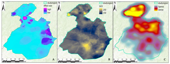 Lightning-fire distribution: (A), rasterized lightning-fire-affected area; (B), rasterized lightning-fire DOY (day of the year) distribution; (C), rasterized lightning-fire density.