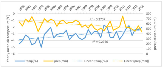 This region has experienced a 40-year trend of decreasing precipitation and increasing air temperature from 1980 to 2019 (Figure 5). The decreasing precipitation trend had a strong fluctuation or reversing change after 2007. Annual precipitation decreased from 635 mm in 1980 to 186 mm in 2019, with an average decrease of 4.65 mm per year. On the other hand, the annual mean air temperature increased from −4.5 °C to −2.3 °C, with an overall increase of 2.1 °C and an average increase of 0.05 °C per year.