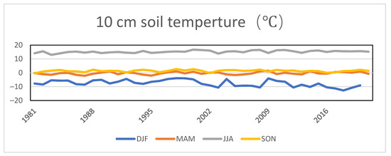 To accurately reconstruct the fire season’s climate conditions, we arranged the different meteorological conditions in different seasons. We first acquired the regional mean value of each season in each year, then put it into a line chart. Moreover, we mainly observed the difference between the fire season (JJA) and other seasons. The surface soil temperature was higher in the fire season JJA when lightning fires were frequent (Figure 6), and it is the hottest season of the year. Combined with the frequency of lightning fires [78], the years frequently disturbed by lightning fires were 2003, 2010, and 2019. All experienced about three years of high-temperature before the fire year (for example, the high-temperature years 2000~2002 before the fire year 2003). There exists a significant increase in the JJA surface soil temperature one year before the high fire-frequency years (2002, 2010, and 2019). Besides, Figure 6 also reveals that there has been a gradual decrease in DJF, MAM, and SON 5 years before high fire-frequency years. The overall surface temperature after the forest fires shows a slight downward trend.
