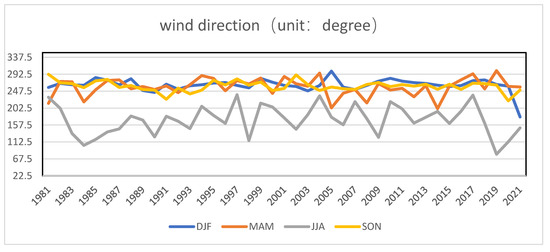 It can be seen from Figure 7 that the seasonal wind direction is mostly east, southeast, and south in summer (JJA). Besides, the wind direction in summer varies significantly with the time changes. Moreover, the southwestern and western winds are the main wind directions in spring (MAM), autumn (SON), and winter (DJF). Very few years existed with the northwestern and northern winds. From the high firefrequency years, 2003, 2010, and 2019, we found that the wind direction in the summer was dominated by the southeastern wind, and the winter and spring were dominated by the western wind.