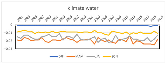 The climatic moisture content chart (Figure 8) reveals a long-term regional climatic moisture deficit in the MAM, JJA, and SON seasons. However, this is not apparent for the DJF season. Every MAM and JJA experienced a water deficit for a long time. The spring moisture deficit is numerically higher than the summer moisture deficit. We can find more severe moisture deficits for the high fire-frequency years in 2002, 2010, and 2019. It is noteworthy that a more severe moisture deficit was observed in the next year after each high fire frequency year.