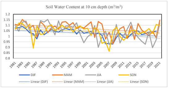 The surface soil moisture content generally decreased over 40 years (Figure 9). Among all the seasons, SON showed a steady declining trend, while JJA showed a steeper decreasing trend. Usually, the surface soil moisture content was higher in MAM than in JJA. In 2003, 2010, and 2019, the surface soil water content showed a uniquely high level in MAM. However, it was low in JJA. Moreover, in the next year after a significant fire year, there was a large increase in spring surface soil water content.
