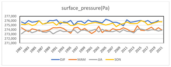 The surface pressure is stronger in SON and DJF than in JJA and MAM (Figure 10). JJA has the lowest surface pressure. The surface pressure difference between MAM and JJA is low. On the contrary, the surface pressure difference between SON and DJF largely differs from between MAM and JJA. In the significant fire years of 2003, 2010, and 2019, there was an increasing surface air pressure in MAM of the following year after a high firefrequency year.