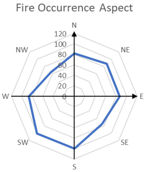 From the statistical chart of the lightning-fire-occurrence aspect (Figure 11), it is easier for lightning fires to occur on the southwestern slope, as reflected by the 101 fires, followed by the southeastern slope with 100 fires. The least occurring slope is the northwestern slope, with 64 cases. Lightning fires are more likely to occur on the sunny slopes, such as the southwestern and southern slopes, and are less likely to appear on the northwestern or shady slopes.