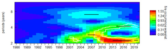 We applied a wavelet analysis to the climatic conditions to further study the temporal change. We drew Morlet wavelet transformations to analyze the lightning-fire occurrence and the periodic changes of fire-related climatic indices. The Morlet wavelet transformation diagram shows that the concentrated event of lightning fires is from 3 years to 7 years (Figure 12). Lightning-fire occurrence has temporally local characteristics. The occurrence of lightning fires has increased sharply in the last decade. There is an increasing trend after 2000, and, especially, the most recent 10 years show an excessively increasing trend.