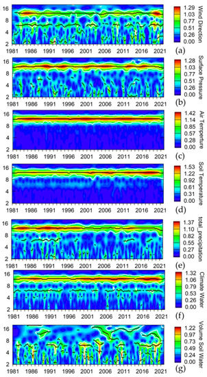For the cyclical variability of fire-related climate conditions, the wind direction had a 15-year primary cycle and a 7-year subcycle (Figure 13a). The surface pressure had a strong interannual periodicity of 15 years (Figure 13b). The surface air temperature (Figure 13c) and soil temperature (Figure 13d) are significant in a 15-year cycle. In contrast to surface air temperature, surface soil temperature periodicity varies a lot over time, showing a gradually increasing trend over the whole study period. The total precipitation (Figure 13e) and climate water deficit (Figure 13f) had a primary interdecadal cycle of 15 years and a subcycle of 7 years. On the contrary, the surface soil water content (Figure 13g) had a different quasiperiodic variation of 7 years, with a sub-cycle of 4 years.