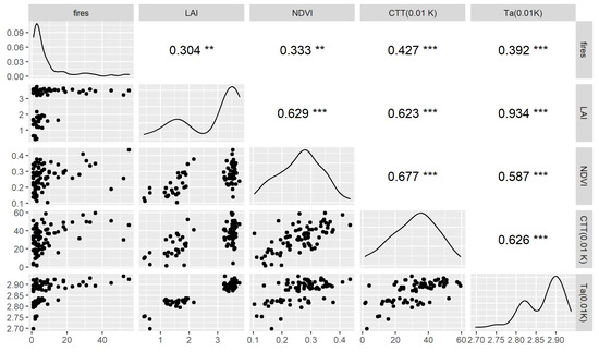 Due to a large amount of data, we need to choose the indexes most related to fire scale by applying an exploratory regression analysis in ArcGIS software [68]. The exploratory regression analysis can determine the possible combinations of exploratory variables that can best perform in an OLS model. It is a data mining tool aiming at applying data dimensionality reduction [69]. By evaluating all the possible variables and variable combinations, we have more chances to find the best varying variety and maximumly reduce the interference of the irrelevant variables [70]. We defined the fire-affected areas as the dependent variable and the surface influence factors as the independent values. In choosing the best models, we ranked them based on the adjusted R2, variance inflation factor (VIF), and Akaike Information Criterion (AIC) to find which climate and vegetation condition combinations are easier to occur in large fires. The VIF evaluates whether there is overfitting and multicollinearity in our regression model. A smaller VIF means better performance. The AIC is to evaluate the model’s fitness. A smaller AIC value means that the model fits the sample data better. The adjusted R2 measures data fitness degree, generally in the range of (−∞, 1). The larger values of adjusted R2 indicate better performance of the model. In our study, the VIF is the constraint factor, meaning we only evaluate those combinations under VIF 7.5 and choose the smallest VIF model. The correction coefficient, adjusted R2, and the AIC determine the performance of different combinations. We also performed a spatial autocorrelation test to avoid multicollinearity errors in order to evaluate the model residuals.