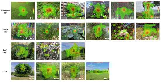 The results of the reliability test (Cronbach’s α = 0.687), validity test (KMO = 0.576), and Bartlett’s test of sphericity (p = 0.000) indicated that the questionnaire data were suitable. Among the different types of vegetation types, bamboo plants (I-E) and broad-leaved trees (I-C) had relatively high scores (Figure 2). Shrubs (I-B) and coniferous trees (I-D) had the lowest scores of 3.39 and 3.32, respectively. Concerning flower color, white flowers (II-E) had a relatively low score of 3.14. Concerning leaf color, the green leaf (III-A) had the lowest score of 3.32, which was significantly lower than the score of the yellow leaf (III-B) and the red leaf (III-C) (p < 0.05). Among the layers, tree + shrub + grass (IV-A) had a relatively high score of 4.00. The score of grassland (IV-D) was 3.44, which was the lowest. The differences in the subjective ratings among the different categories were not significant (p > 0.05).