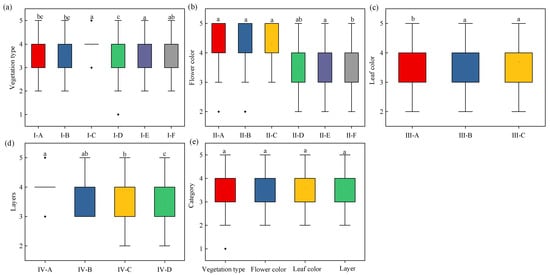 The subjective ratings of four categories in urban ornamental plants are shown; (a–e) represent vegetation type, flower color, leaf color, layers, and categories, respectively; I-A–I-F represent grassland, shrub, broad-leaf tree, coniferous tree, bamboo, and palm, respectively; II-A–II-F represent blue, red, pink, purple, white, and yellow flowers, respectively; III-A–III-C represent green, yellow, and red leaves, respectively; IV-A–IV-D represent tree + shrub + grass, shrub + grass, shrub, and grass, respectively. Different lowercase letters indicate significant differences among different attributes with the same category (p < 0.05). Little square represents the mean and rhombus filled with black represents outliers.
