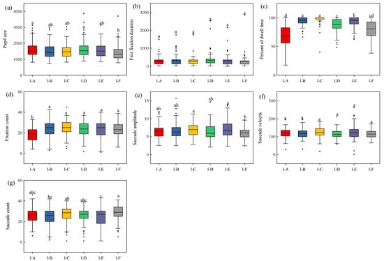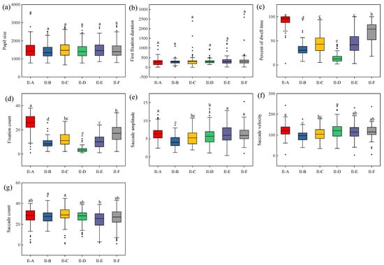 The eye-tracking measures of vegetation type are shown; (a–g) represent pupil size, first fixation duration, the percentage of dwell time, fixation count, saccade amplitude, saccade velocity, and saccade count, respectively; I-A–I-F represent grassland, shrub, broad-leaf tree, coniferous tree, bamboo, and palm, respectively. Different lowercase letters indicate significant differences among different attributes with the same category (p < 0.05). Little square represents the mean and rhombus filled with black represents outliers.