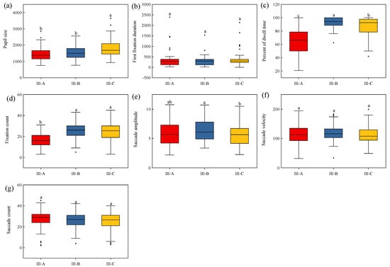 Eye-tracking measures of leaf color are shown, (a–g) represent pupil size, first fixation duration, the percentage of dwell time, fixation count, saccade amplitude, saccade velocity, and saccade count, respectively; III-A–III-C represent green, yellow, and red leaves, respectively. Different lowercase letters indicate significant differences among different attributes with the same category (p < 0.05). Little square represents the mean and rhombus filled with black represents outliers.