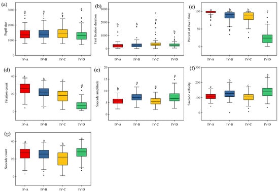 Eye-tracking measures for different layers are shown, (a–g) represent pupil size, first fixation duration, the percentage of dwell time, fixation count, saccade amplitude, saccade velocity, and saccade count, respectively; IV-A–IV-D represent tree + shrub + grass, shrub + grass, shrub, and grass, respectively. Different lowercase letters indicate significant differences among different attributes with the same category (p < 0.05). Little square represents the mean and rhombus filled with black represents outliers.