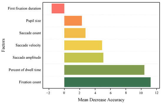 The best combination of trees in the random forest classification model (500) was determined for the highest accuracy of the random forest model. The OOB (out of the bag) error estimate of the error rate of the random forest was 53.72%, which indicated that the variable explained 46.28% of subjective ratings. The order of mean decrease accuracy of eye-tracking measures concerning subjective ratings was fixation count > the percentage of dwell time > saccade amplitude > saccade velocity > saccade count > pupil size > first fixation duration (Figure 8).