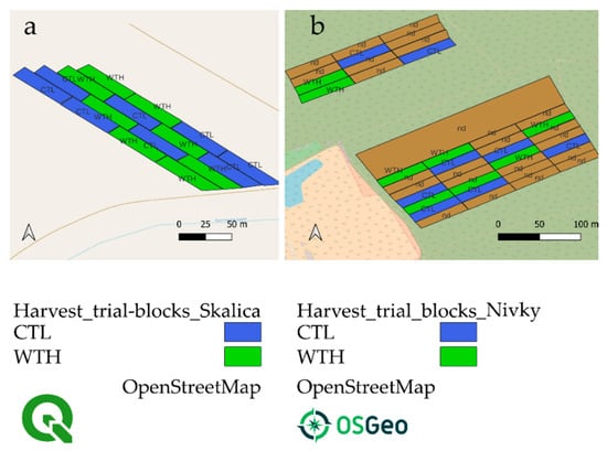 Four alternative treatments were obtained from a simple and robust factorial design comprising CTL and WTH systems tested in both sites, i.e., Nivky and Skalica. Each treatment was assigned 8 plots per site (except for the combination “CTL*Nivky”, which was replicated 9 times), each covering an area between 0.08 and 0.10 ha, equal to 114 and 190 trees per plot (Figure 1).