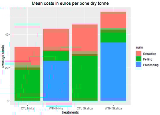 The total costs of the operation are EUR 32.45 ODT−1 and EUR 43.25 ODT−1 for CTL and WTH, respectively, in Nivky, and EUR 45.82 ODT−1 and EUR 53.57 ODT−1 for CTL and WTH, respectively, in Skalica.