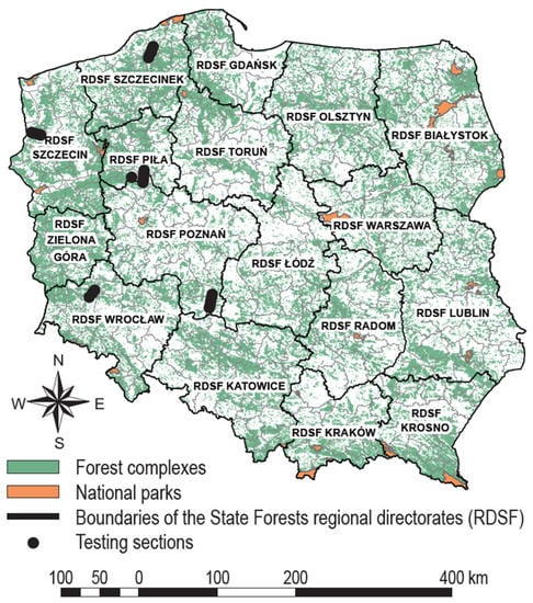 Locations of the test road sections on the afforestation map of Poland (adapted from The State Forests in Figures 2018 [] with permission from State Forests Information Centre, Warsaw, Poland, 2022.