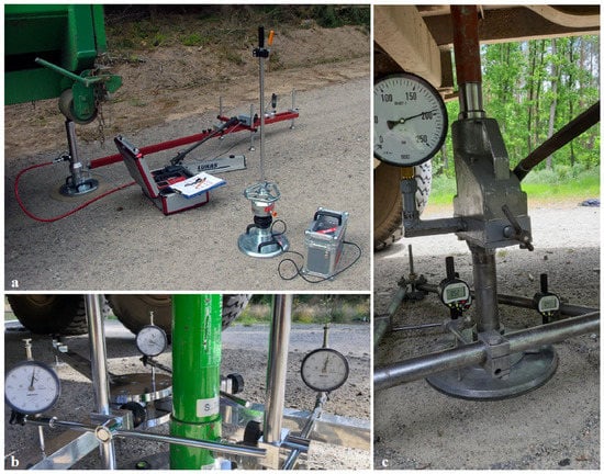 Equipment used for measuring the bearing capacity of forest roads: (a) light falling weight deflectometer Zorn ZFG 3000 GPS (foreground), and static load plate HMP PDG Pro (background); (b) static load plate VSS-3P-000 with 3 analogue displacement sensors; (c) static load plate VSS-3P with 3 electronic displacement sensors (Photos: S.M. Grajewski).