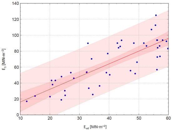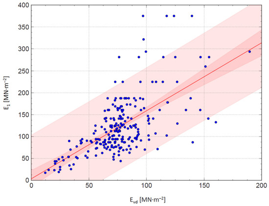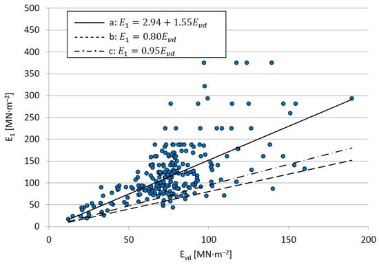 A curiosity that needs to be further investigated is the fact that thus far, there is no unambiguity in assessing which modulus (primary or secondary) can be more accurately estimated by the value of the dynamic deformation modulus. Some studies point to E1 [,,,], while others point to E2 [,,,,,]. Analogous analyses that were performed on the same data set for the secondary deformation modulus showed that Evd was a better estimator for E2 values than for E1 [].