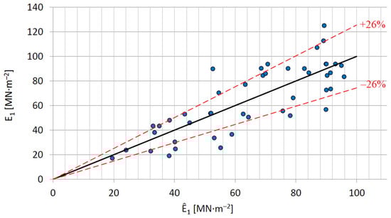 A comparison of the E1 values that were obtained during the test (yi) with the predicted values () using the best-fit model, is shown in Figure 5. The relative error of the prediction RE according to the linear regression model described by the equation E1 = 0.11 + 1.60Evd and determined by Formula (4) was ±26% (Figure 5).