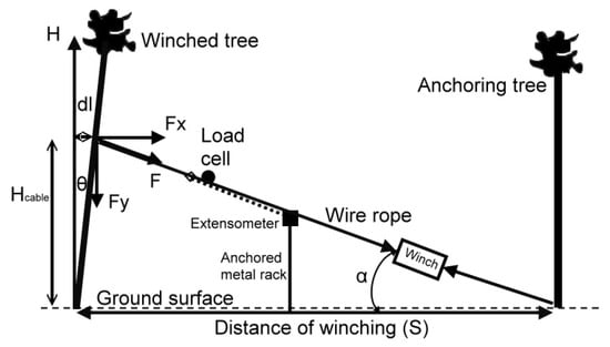where Fx = applied force in the horizontal direction; Fy = applied force in the vertical direction; F = applied force in the wire rope; Hcable = height of the attachment point at the winched tree; θ = deflection angle of the winched tree; α = angle between the wire rope and the ground surface. We estimated most stem diameters to be approximately 18–25 cm, and we considered the tree stem to be a rigid element. We attached the extensometer to the wire rope close to its point attachment to the trunk, 1.3 m above the ground. We measured the lateral displacement of the trunk at the 1.3 m level, with reference to a metal rack anchored in the ground during the pulling test. The recorded displacement represents the tree’s lateral displacement at an angle α to the ground surface (as shown in Figure 1). During testing, we calculated the deflection angle θ of the winched tree at a given pulling displacement (dl), using the law of cosines.