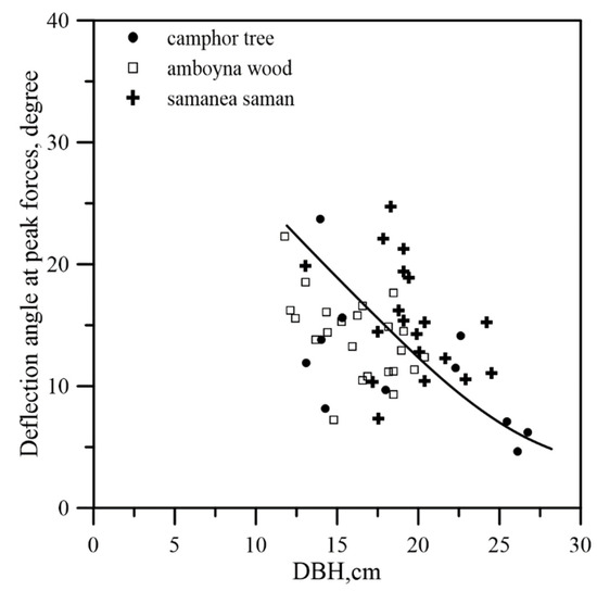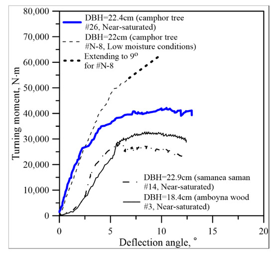The winching tests resulted in the cracking and bulging of the ground surface around the winched trees. Figure 2 shows the relationships between the turning moments and the deflection angles obtained in this study for the camphor tree, samanea saman, and amboyna wood. We found that turning moments in low-moisture soil conditions were noticeably higher than in near-saturated soil conditions. In near-saturated soil conditions, the maximum turning moment occurred at a deflection angle of about 8–10°. However, tree samples in low-moisture soil conditions did not reach their maximum turning moment value, due to the capacity of the pulling system. Figure 3 plots the deflection angles (θmax) for trees at maximum pulling forces in near-saturated soil conditions, against DBH values for all three species; the θmax values ranged from 6° to 20° at DBHs of 12 to 26 cm, and the θmax values decreased with lower DBH values. Based on the test results obtained for camphor trees in near-saturated soil conditions, we found that most deflection angles were greater than 8–10° for trees winched at a height of 1.3 m that were subjected to the maximum pulling forces.