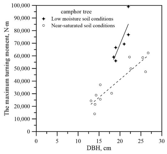 We estimated the maximum resisting moment for camphor trees in low-moisture soil conditions by extending the relationship between the turning moment and the deflection angle (θ) to a θ value of 9°, as shown in Figure 2. We anticipated a close relationship between the root anchorage and the age of the tree, as indicated by tree geometry [41]. For example, Saint Cast et al. (2019) [41] reported that the stump diameter of Pinus pinaster in France increases from 2.5 cm at the age of 3 years to 20 cm at the age of 13 years. Figure 4 shows the relationship between the maximum resisting moment (TMmax) and DBH for camphor trees in low-moisture and near-saturated soil conditions. The TMmax values increase with DBH, and TMmax correlates well with DBH. TMmax values in near-saturated soil conditions are about 40–45% lower than in low-moisture soil conditions, when measured at DBHs of 18–23 cm. This represents a considerable reduction in the turning resistance of trees, due to an increase in soil saturation ratio from about 10% to 77%. Moreover, the ratio of the maximum resisting moment to DBH in near-saturated soil conditions is about 35% of that seen in low-moisture soil conditions. The simple linear regression equations between TMmax and DBH for camphor trees are listed in Table 3.