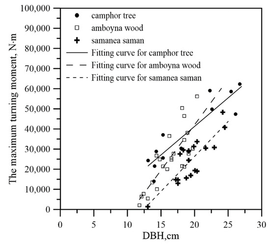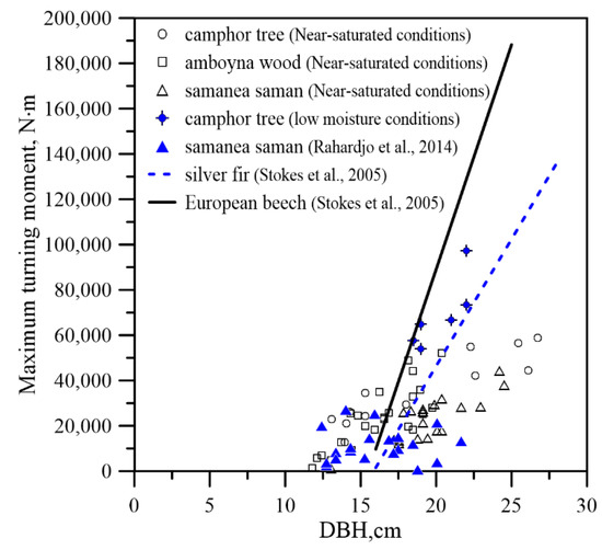 In line with previous research [4,6,15], our results show that the TMmax values correlate well with DBH measurements. Figure 7 presents the data obtained in this study and from similar previous studies in Asia and European countries [6,15]. Rahardjo et al. (2014) [15] also conducted pulling tests with samanea saman, and their data correlate well with ours. Correlations between TMmax and DBH for silver fir and European beech are close to the corresponding figures that we obtained for camphor trees with DBHs of 18–22 cm of soil in normal soil conditions. These data further support the results obtained in this study. Previous research [5,6,42] also supports our finding that TMmax has a closer association with DBH than with tree height, although TMmax also correlates well with stem volume [5,42]. In any case, the DBH of trees is easy to measure in the field and can be considered a suitable variable by which to estimate tree TMmax values.