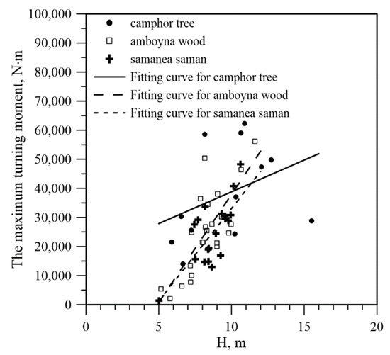 Figure 6 shows the relationships between the maximum resisting moment and tree height (H) for a camphor tree, amboyna wood, and samanea saman in near-saturated soil conditions. The correlations between TMmax values and H are fair for amboyna wood and samanea saman but are poor for the camphor tree. These results suggest that DBH seems to be a better tree characteristic for estimating the turning resistance of trees compared with tree height. Table 5 lists the regression equations for the relationship between TMmax and H in near-saturated soil conditions.
