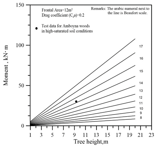 Figure 8 shows the turning moment applied at the bottom of trees subjected to various wind speeds, as represented by the Beaufort scale, at different tree heights for a frontal area of 12 m2. Figure 8 also shows the experimental result of the winching test for amboyna wood, with a frontal area of 12 m2. This datum indicates that the tested tree (amboyna wood) can resist winds at level 15 on the Beaufort scale, which corresponds to a moderate-intensity typhoon. In this study, we applied this procedure to all the experimental results obtained for samanea saman and amboyna wood to determine the tree resistance to typhoons, in terms of the Beaufort scale. We found that the maximum tolerable wind speed, expressed using the Beaufort scale, is related to DBH and to the canopy’s frontal area.