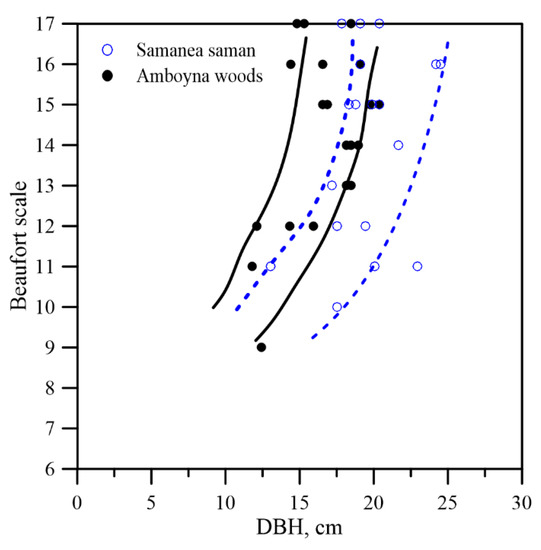 In this study, we sought to identify the relationships between wind resistance, DBH, and the frontal area of the tree canopy for both samanea saman and amboyna wood. However, this is a challenging task because the canopy’s frontal area may vary with time, due to the growth of the tree and the pruning of branches. To express matters more simply, Figure 9 shows the relationship between DBH and the level of wind strength, which samanea saman and amboyna wood trees can resist, and ignores the effect of the canopy’s frontal area. The data show that, as the DBH increases, the ability of these trees to withstand severe winds increases. The figure also plots the upper and lower bounds for the DBH data points against wind speed levels, recorded using the Beaufort scale. The Beaufort scale level for a specific DBH can be considered to be the likely maximum level at which that specific tree is able to resist the wind loads that are typical of typhoons. Figure 9 shows that the ability of amboyna wood to resist severe winds is greater than that of samanea saman. For example, samanea saman trees with a DBH of 17.5 cm can resist winds at levels 10–14 on the Beaufort scale, while amboyna wood trees with the same DBH can resist winds at levels 13–17.