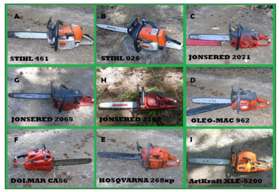 Nine farms were selected, and each owner was informed with the aim of the study, and for this reason, each farm lends the chainsaw for the test. Therefore, nine different chainsaw models (Figure 1) were selected, and their characteristics are reported in Table 1. To reduce the uncertain variability, the study was developed under controlled conditions i.e., during the tests, the chainsaws were operated by the same operator, aged 48, with 20 years of work experience, and the field test was free from external artificial noises. The daily exposure values were normalized to three different scenarios: four, six, and eight hours, on the basis of information given from the owners.
