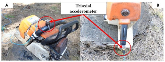 The triaxial accelerometers position on the chainsaw on the front (A) and rear (B) handles.