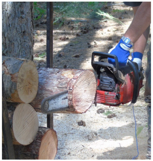 The cross-cutting tests were conducted on wood logs with an originally length of 2 m and a diameter ranging from 23 to 25 cm at the middle of their length. They were placed on a sawbuck 45 cm above ground, so that the operator was able to cut slices of approximately 5 cm width. Wood density was determined in laboratory (in according with ISO 13061-1) [34] using wood samples from each disc generated during the cross-cutting test. Oven-dry density results in 520 kg/m3 and 715 kg/m3, respectively, for Corsican pine and European beech.