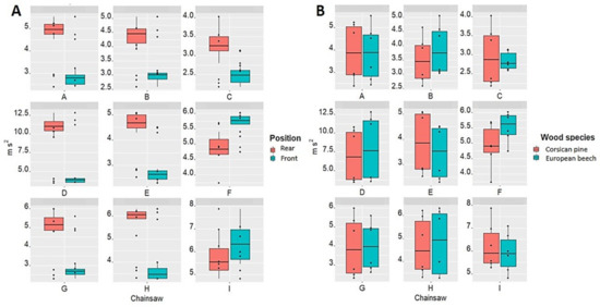 The chainsaws F and I have generated similar vibration values for both handles without differences between softwood and hardwood (Figure 4), as shown by the LSD test. The other chainsaws reported a significant difference between the rear and front handle position: on average +44% during cross-cutting of softwood and +38% for hardwood. Anyway, the differences considering the type of wood used result in being slightly not significant (p-value 0.055), probably due to the high effect due to the chainsaw type. Consequently, the vibration values during the cross-cutting of Corsican pine and European beech were not statistically different, disproving the experimental hypothesis, despite comparing a softwood with a hardwood species.
