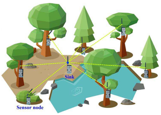 Since the forestry Internet of Thing (IoT) is developing in a more refined way, this will undoubtedly drive and advance the development of a large number of low-cost sensor nodes and wireless communication. Sensors with data-processing capability are placed in the air, tree trunk, or its root soil to automatically monitor and collect the temperature, humidity, nutrients, wind direction, wind, depression, and moisture content and automatically process these signals on the network. The basic architecture of a forestry IoT system is shown in Figure 1. However, the actual deployment of WSN nodes faces many difficulties, such as the lack of wide network coverage, relatively high infrastructure costs, short node battery life, and high energy consumption. Therefore, Long Range(LoRa)technology, which can provide low power consumption and remote wireless transmission, has been widely used.