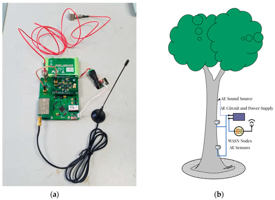 Sample wireless AE node and its installation measurement schematic. (a) Sample wireless AE node; (b) its installation measurement schematic.