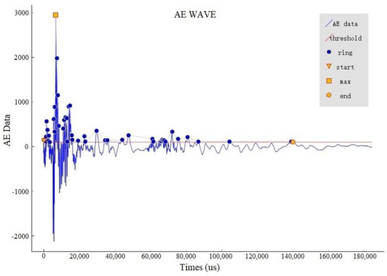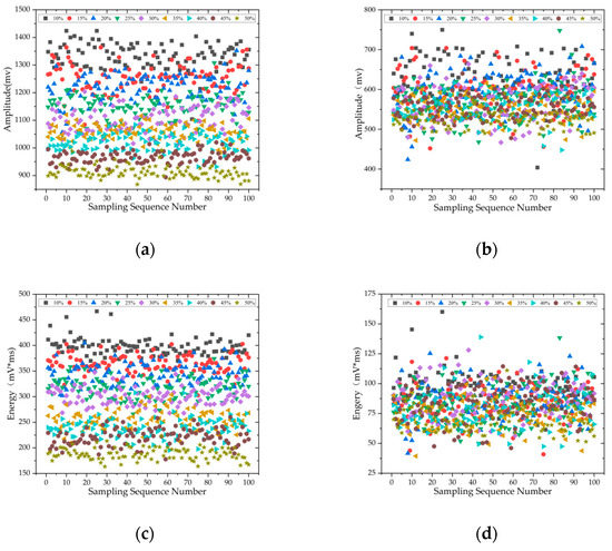 The AE data collected by all WASN nodes can be sent to the gateway for aggregation and display, and the collection curve is shown in Figure 4. Each characteristic parameter (amplitude, rise time, duration, ringing count, and energy) is then used to construct the data sample set for moisture content determination.